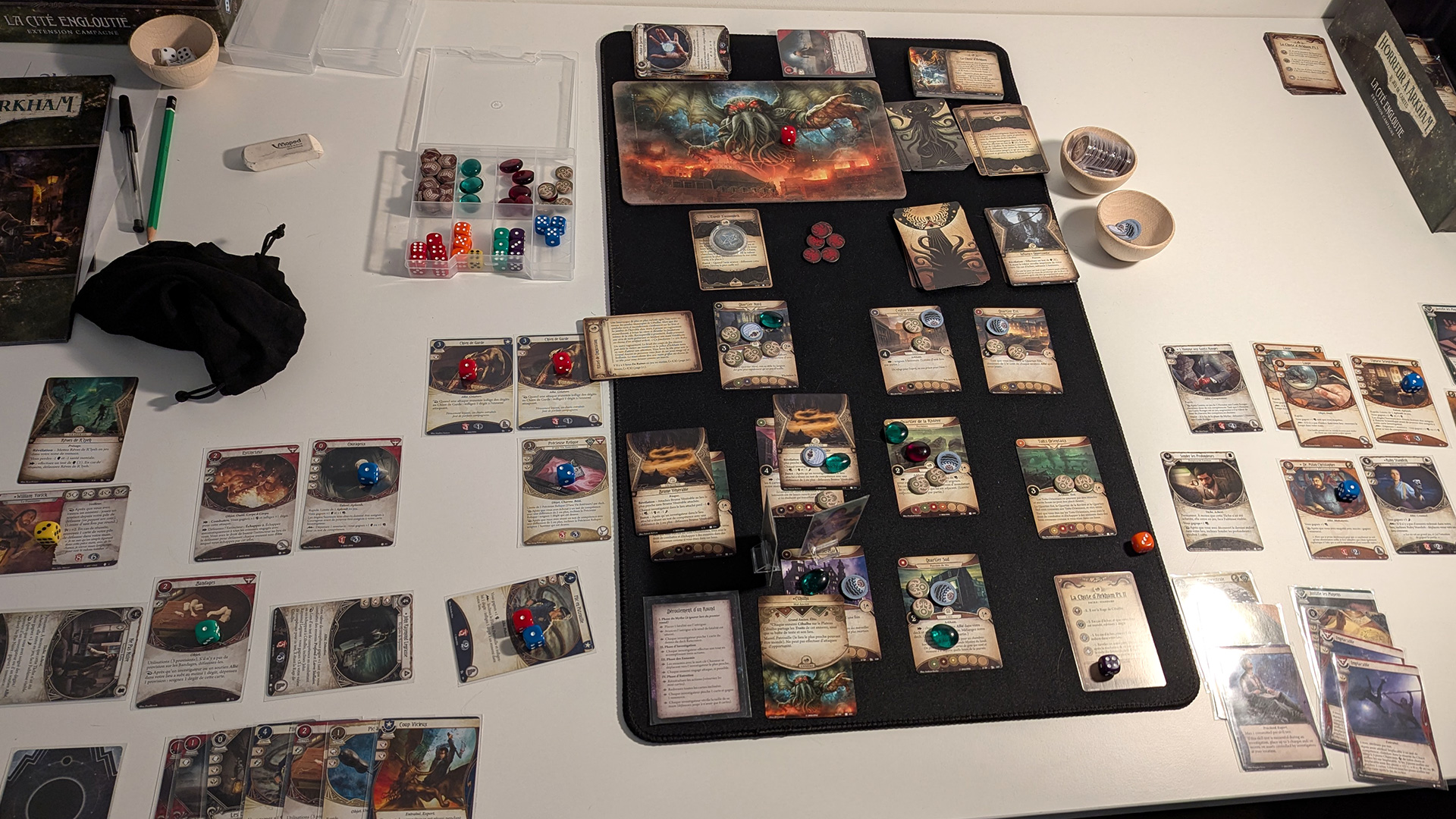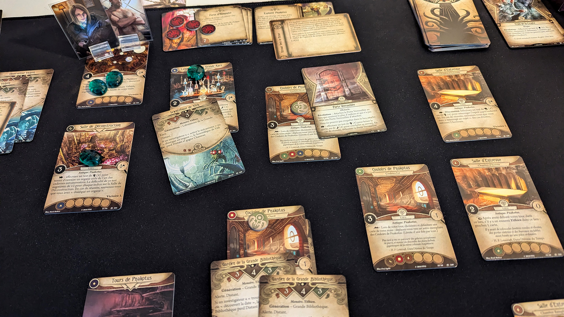 Une fois notre deck prêt, on peut affronter un scénario. La mise en place est parfois un peu pénible, et c'est le seul point faible du jeu : il offre une certaine lourdeur, mais c'est le prix à payer pour avoir accès à autant de contenu et de richesse ! Une fois en jeu en revanche, c'est passionnant. Le jeu est doublement narratif. D'une part, les scénarios racontent systématiquement une histoire, généralement inspirée des nouvelles de Lovecraft. Mais la narration passe aussi par le gameplay. Les personnages possèdent de la personnalité, les cartes racontent quelque chose et on vit de réels moments de narration émergente à chaque partie.