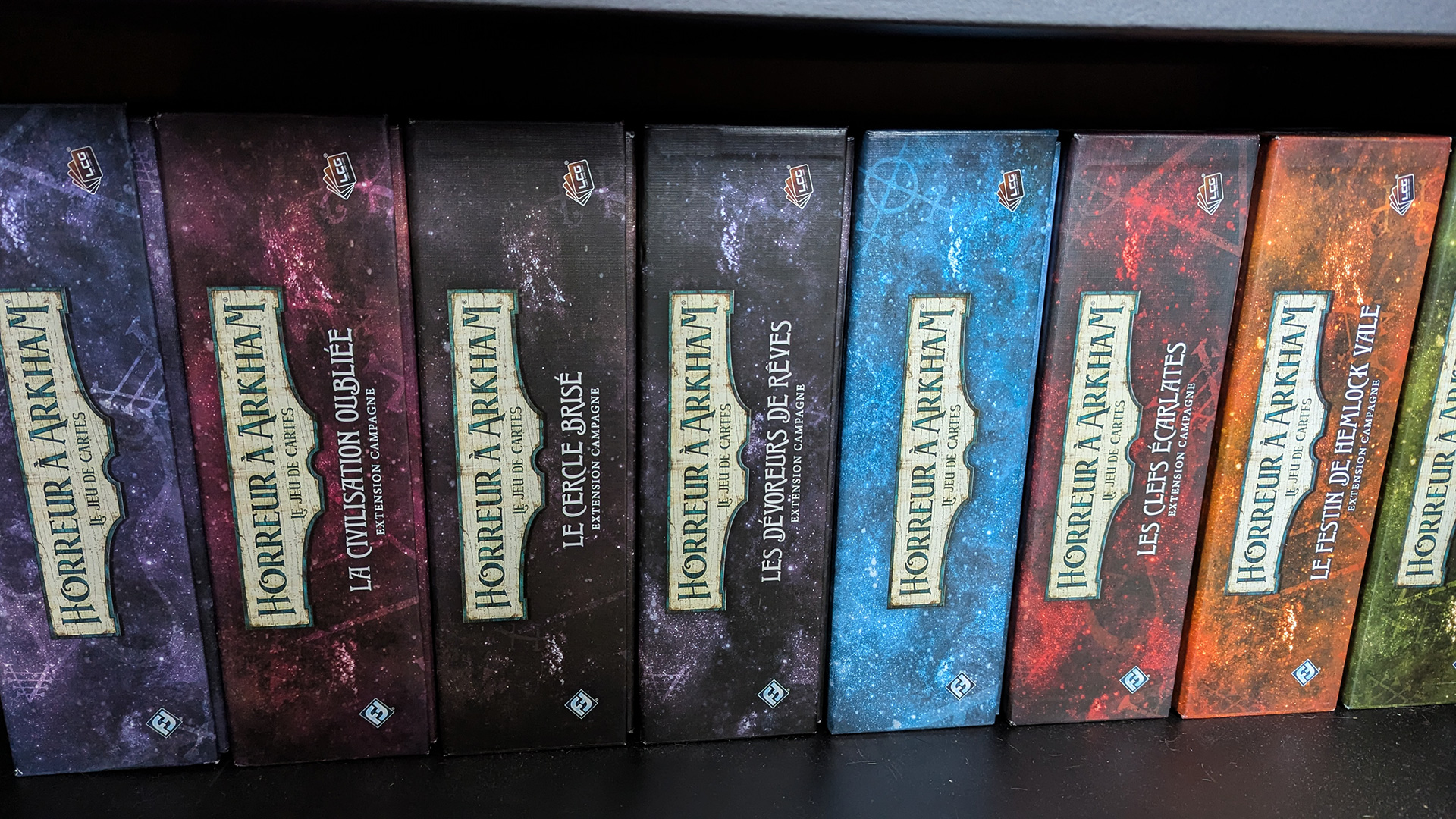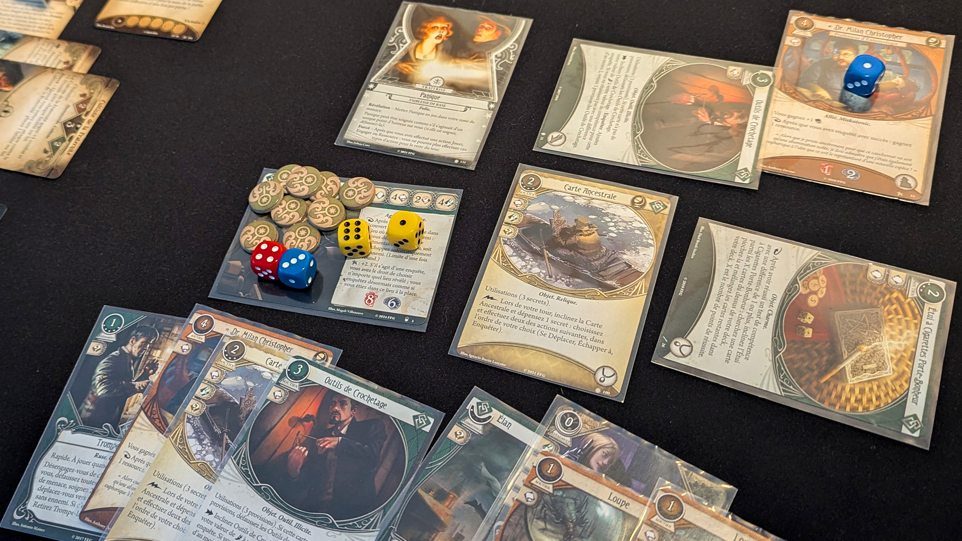 C'est là que sont apparus les jeux de cartes évolutifs dans ma vie. Ils proposent tout ce que j'aime : de la construction de deck, un jeu intéressant, du solo et surtout une grande richesse, mais sans avoir besoin d'acheter des boosters aléatoires. Il en existe plusieurs, comme Marvel Champion ou Le seigneur des anneaux. Je ne doute pas qu'ils soient très bons également, mais mon amour pour l'univers de Lovecraft a clairement fait pencher la balance et je me suis lancé à fond dans Horreur à Arkham.