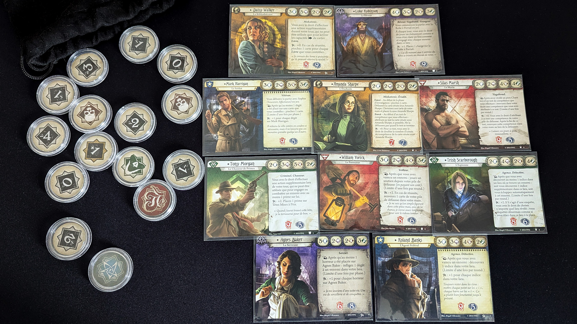 Horreur à Arkham est plutôt difficile commence donc par le choix d'un personnage et la création de son deck. J'ai été ravi de découvrir que les possibilités sont variées et les decks très riches. Deux investigateurs différents ne se jouent pas du tout pareil, car ils ont tous des règles de construction différentes, ainsi qu'un petit pouvoir qui va généralement tout changer. On retrouve un peu le concept des 5 couleurs de Magic qui dans Horreur à Arkham deviennent des classes différentes, avec chacune leur façon d'approcher les problèmes. Parvenir à manier un nouveau deck demande un certain temps d'apprentissage, ce qui rend l'expérimentation très intéressante et gratifiante.