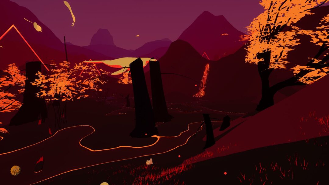 Pour ajouter un peu d'originalité, on a la possibilité d'interagir avec certains objets, ce qui aura pour effet de modifier le monde. Des arbres poussent devant nous, des montagnes apparaissent et des escaliers se déroulent pour nous emmener en hauteur. Chaque chapitre se termine en franchissant une porte triangulaire, ce qui nous permet de progresser et change complètement les couleurs du paysage.