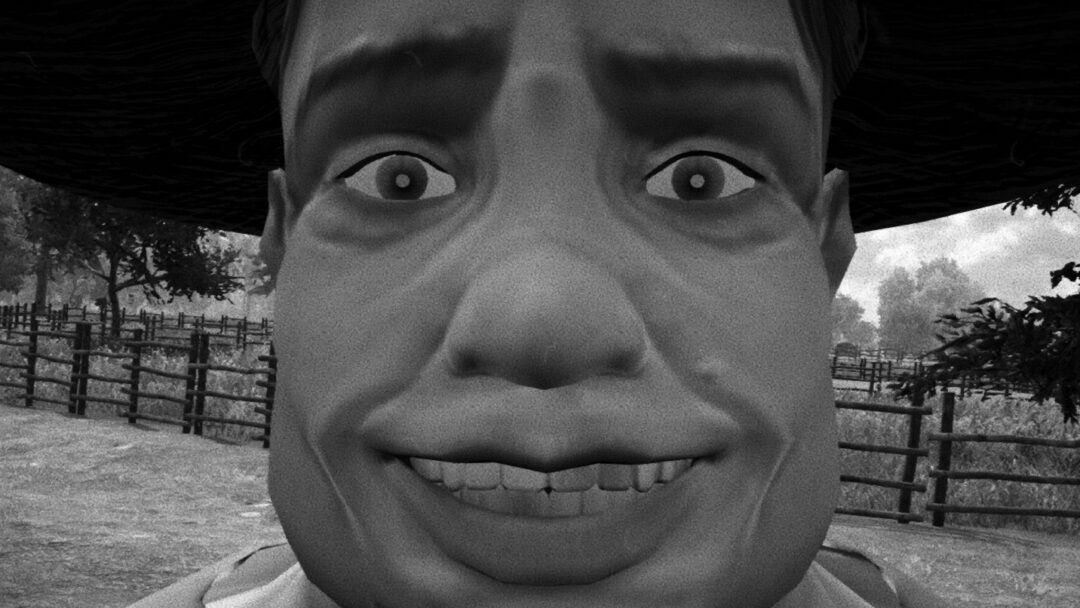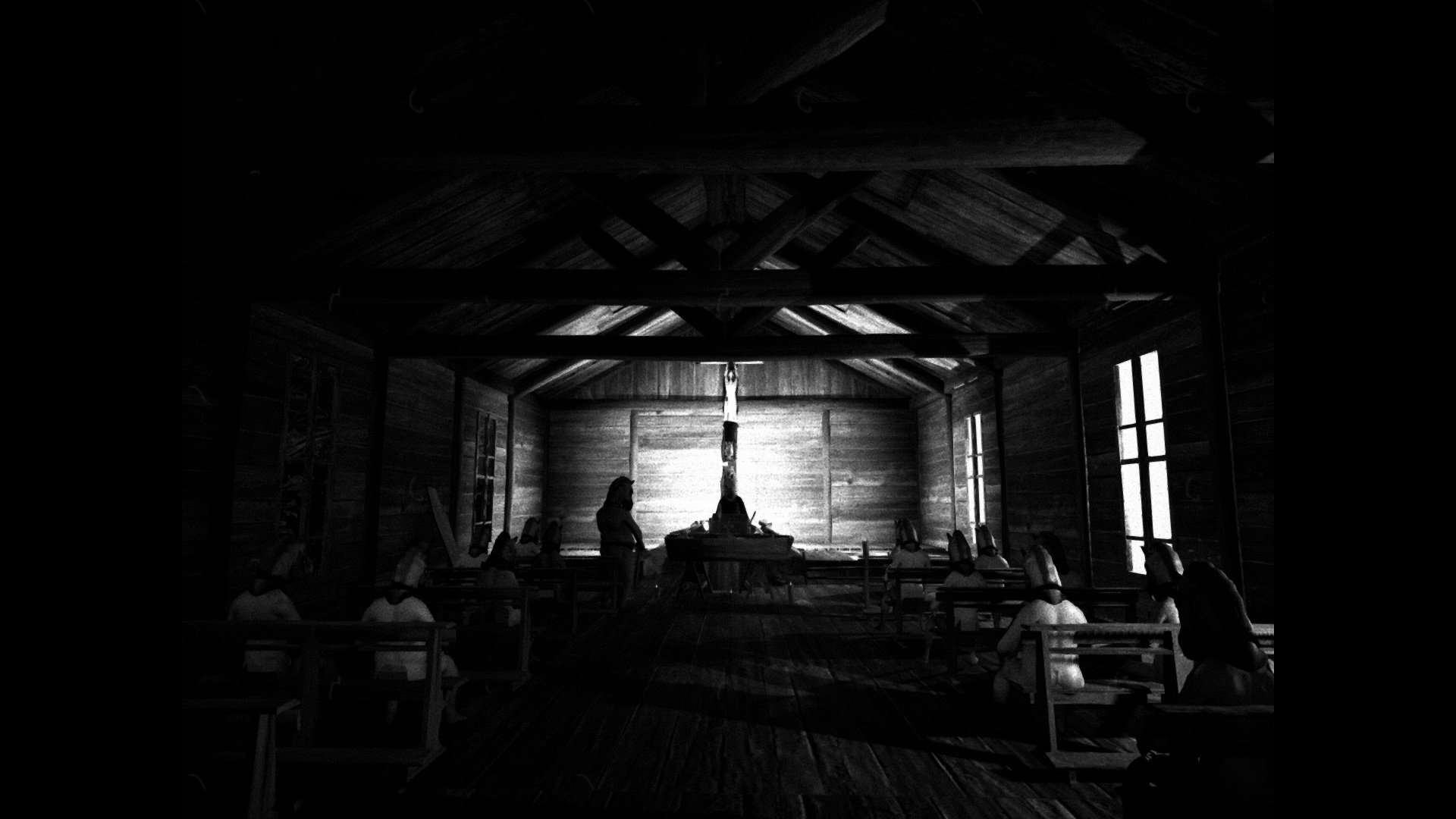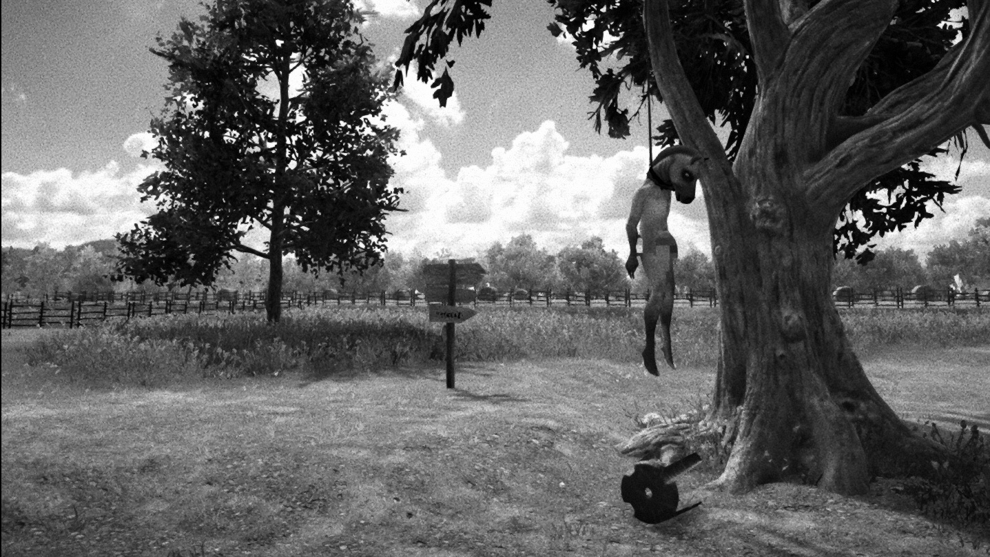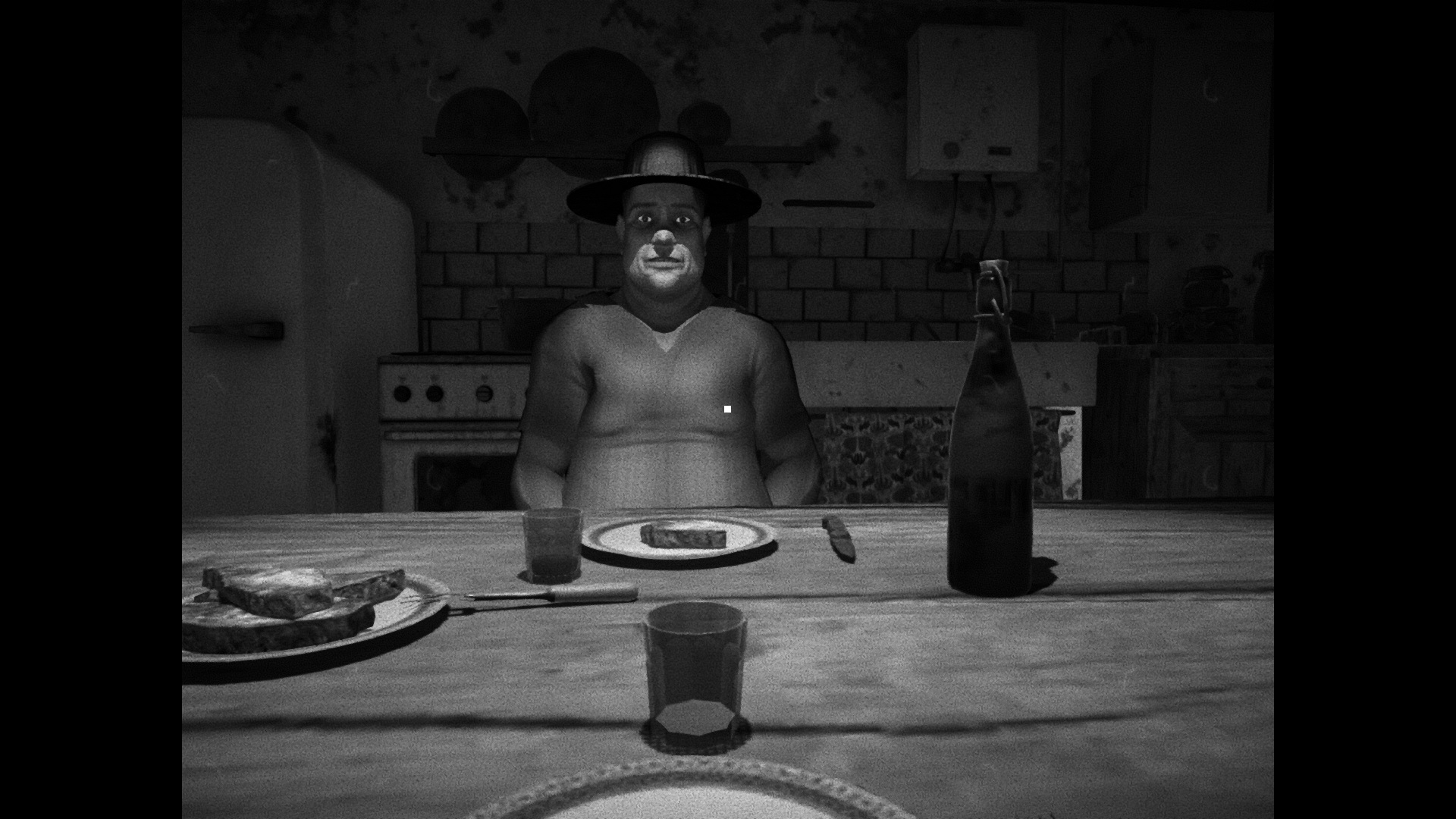 Le jeu commence par un plan sur un vieux projecteur de cinéma. Ce n'est pas un hasard et on découvre bien vite que la mise en scène est particulièrement inspirée par le cinéma expérimental. On se retrouve ainsi plongés dans une esthétique en noir et blanc au format 4/3, façon films muets. De même, les interactions avec les objets sont accompagnées par des cinématiques en FMV (rappelant Jan Švankmajer, une inspiration assumée par l'auteur) qui viennent créer un décalage assez déstabilisant. Si on excepte le cliquetis constant du projecteur, il n'y a jamais de sons et les dialogues apparaissent sur des cartons noirs. On entend parfois quelques bruitages, mais ceux-ci servent en général à rendre plus angoissantes des scènes qui ne devraient pas l'être. Manger un steak n'aura jamais été aussi glauque et si vous n'aimez pas les bruits de mastication, vous allez souffrir...