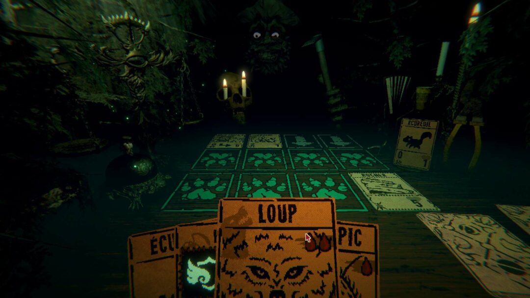 En découvrant les premières images d'Inscryption, je ne peux pas dire que je suis spécialement emballé. On dirait un jeu de deckbuilding avec des éléments de rogue-like, un peu comme Slay the Spire… Ce n'est pas le top de l'originalité, mais bon, pourquoi pas. Les mécaniques s'apprennent rapidement, elles se révèlent assez simples, voire simplistes. Pourtant, les combats sont plaisants et s'enchainent agréablement. Les graphismes sombres et pixelisés ainsi que l'excellente ambiance sonore créent de la tension et du mystère. Tiens… Est-ce qu'une carte vient de me parler ? Mais au fait, qui est cet étrange maitre du jeu dont on aperçoit que les yeux brillants ? Oh… Les touches de directions fonctionnent, qu'est-ce que…