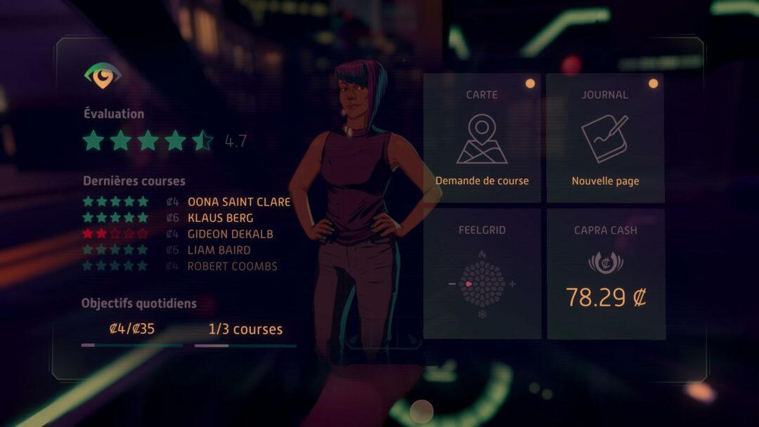 J'ai l'impression qu'il pourrait être pertinent d'inventer un sous-genre comme ça a été fait pour les "walking simulator". On pourrait appeler ces jeux des "simulateurs de discussions pendant que l'on travaille". C'est peut-être un long, mais c'est assez pertinent, car voici encore une fois un jeu narratif qui emprunte ce chemin. En effet, à l'instar de The Red Strings Club ou de VA-11 Hall-A, Neo Cab nous propose d'incarner une chauffeuse de taxi et de dialoguer avec les clients.