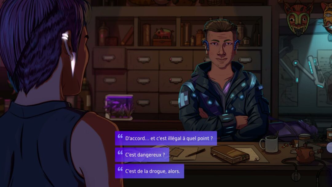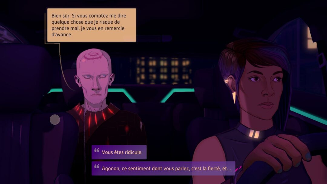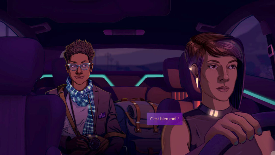 Les thèmes principaux rappellent donc un peu ce que propose la série Black Mirror, à savoir interroger notre rapport à la technologie. Toutefois, je trouve que Neo Cab le fait avec une plus grande subtilité. Les personnages ne sont pas spécialement angoissés et les technologies évoquées plus haut sont considérées comme quelque chose de banal dans cet univers. Les réflexions proposées nous sont rarement jetées à la figure et viennent plutôt se greffer aux dialogues. Même si ces préoccupations me touchent, il n'est pas indispensable de s'y intéresser pour apprécier le jeu qui propose de sujets assez variés.