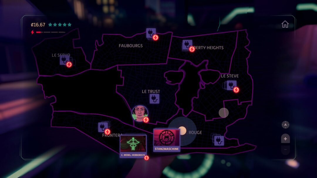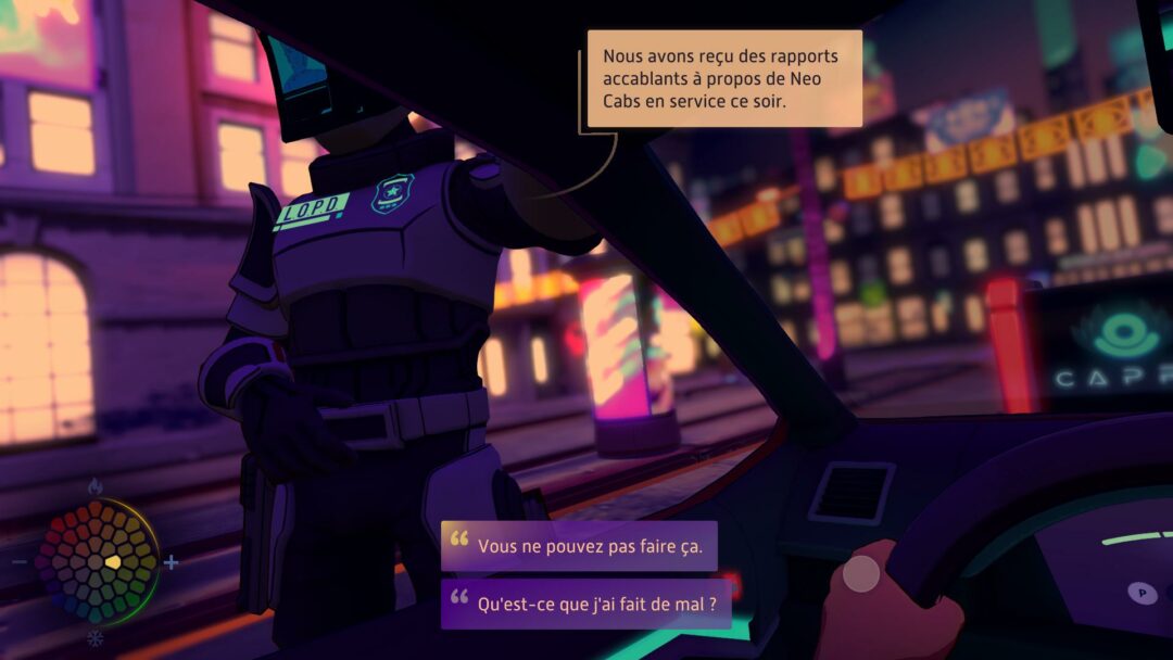 Notez que dans Neo Cab, on ne conduit pas vraiment. En dehors des dialogues, le gameplay est très basique. On doit simplement de choisir nos clients et décider à quel endroit on va refaire le plein ou dormir la nuit. Toutefois, ne voyez pas de ma part une critique de ce genre de jeu. Au contraire, ils me plaisent beaucoup. Il semble toujours s'en dégager une ambiance rassurante, relaxante, agréable… J'imagine qu'accomplir une tâche simple et répétitive vient donner une certaine structure au jeu tandis que les dialogues viennent apporter le plaisir de découvrir une nouvelle personne. En tout cas, c'est le cas dans Neo Cab et j'ai passé un très bon moment dans ce taxi. Les graphismes sont agréables, les personnages rencontrés ont des personnalités originales et les dialogues sont variés.