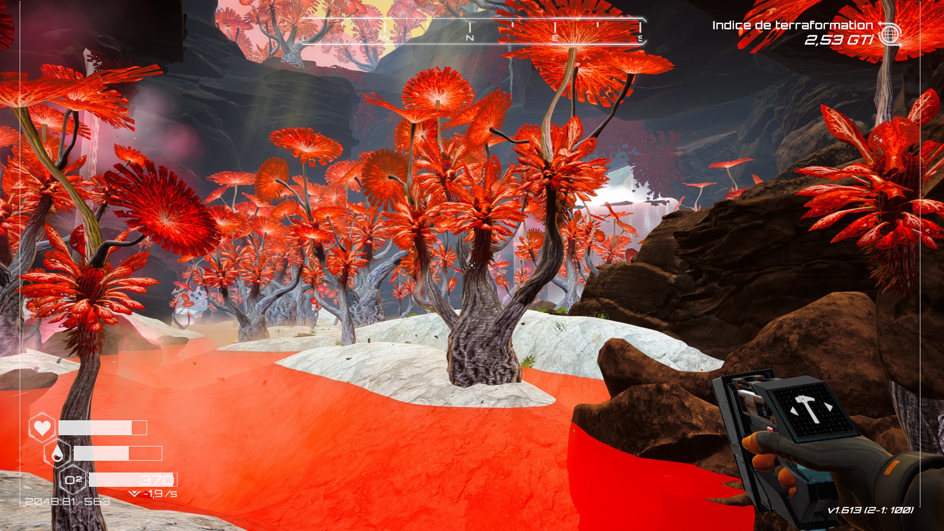 Toutefois, Planet Crafter se focalise vraiment sur ce dernier aspect. La survie est assez rapidement triviale sans être à négliger durant les premières heures, et l'exploration est intéressante sans être renversante. Ça n'empêche pas qu'il y a de belles surprises à trouver, mais c'est plus la cerise sur le gâteau qu'un but en soi. L'intérêt principal est clairement de terraformer la planète. Et de ce côté-là, c'est un vraiment réussi. Notre environnement est au départ une sorte de désert martien, rempli de terre rouge et hostile à la vie. Mais petit à petit, l'eau va apparaitre, l'herbe va pousser et des animaux vont naitre...
