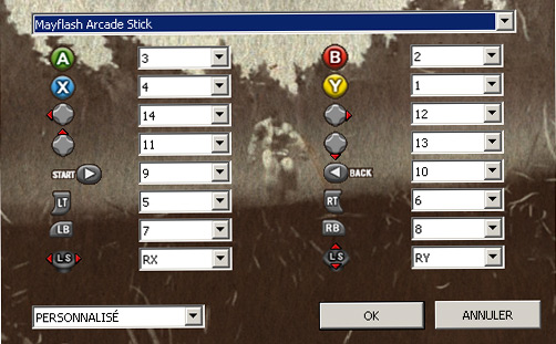 1ère étape : en dehors du jeu, vous devez associer les touches de votre joystick aux touches de la manette Xbox, à savoir les touches, A, B, X... et ce même pour des touches inutiles, par exemple on vous fait attribuer 2 fois les directions, une fois pour la stick analogique, une fois pour la croix directionnelle, quel intérêt ?